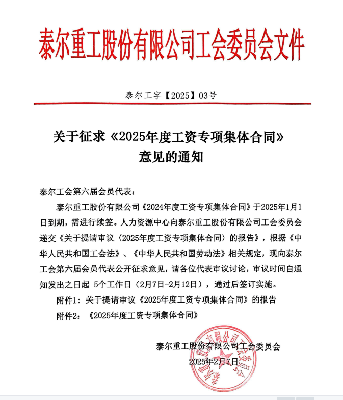 根據(jù)《工會(huì)法》《勞動(dòng)法》的規(guī)定,泰爾公司工會(huì)于2025年2月將公司人力資源中心提報(bào)審議的2025年度《工資專項(xiàng)集體合同》提交公司第六屆工會(huì)會(huì)員代表大會(huì)代表(職代會(huì))進(jìn)行線上公示審議。