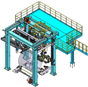 完成冷軋鋼卷的穿心纏繞包裝,可自動完成紙、膜復合包裝或單獨的膜包裝。